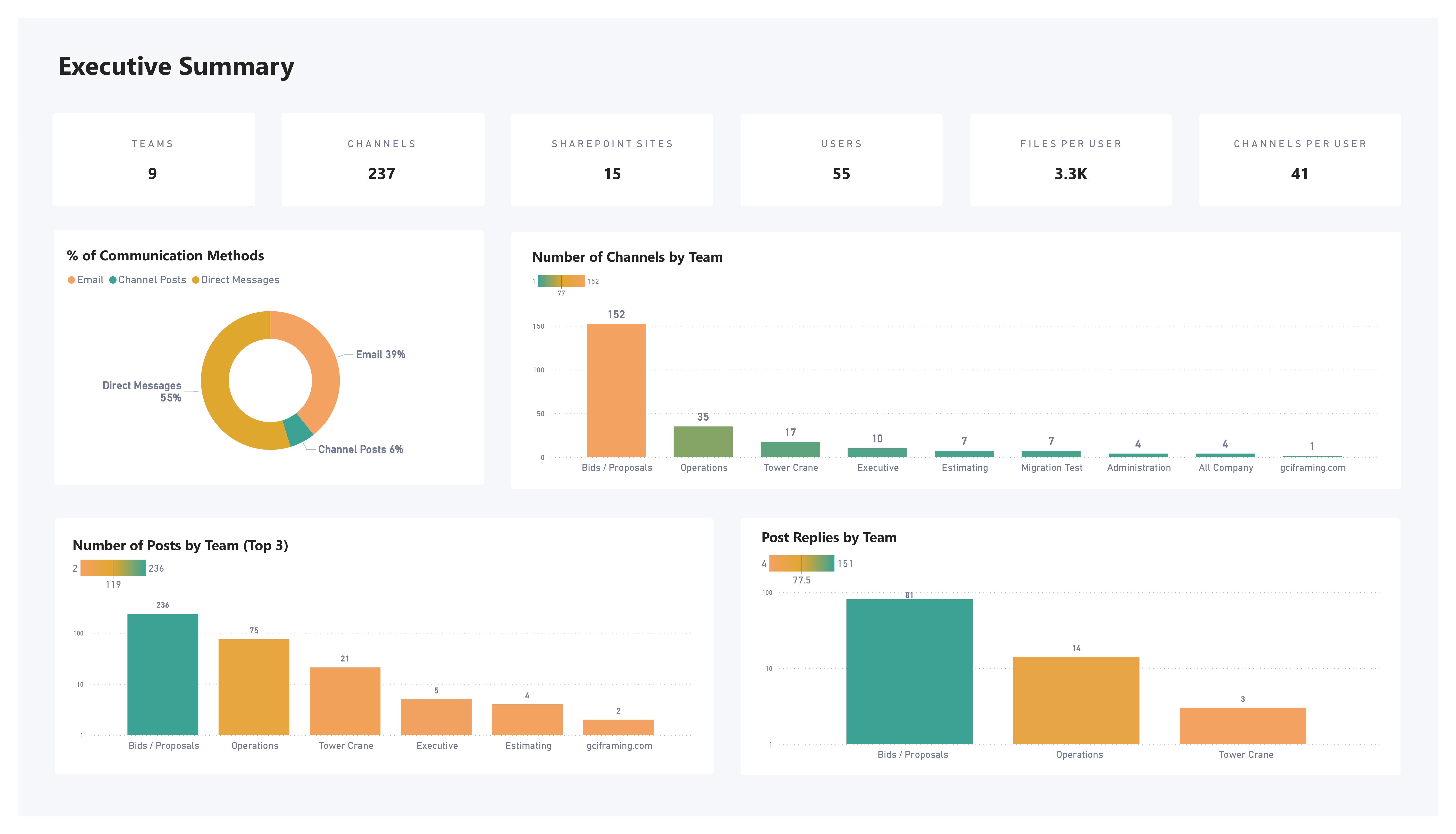 A broad overview of Teams, SharePoint sites, files, and adoption across your tenant.